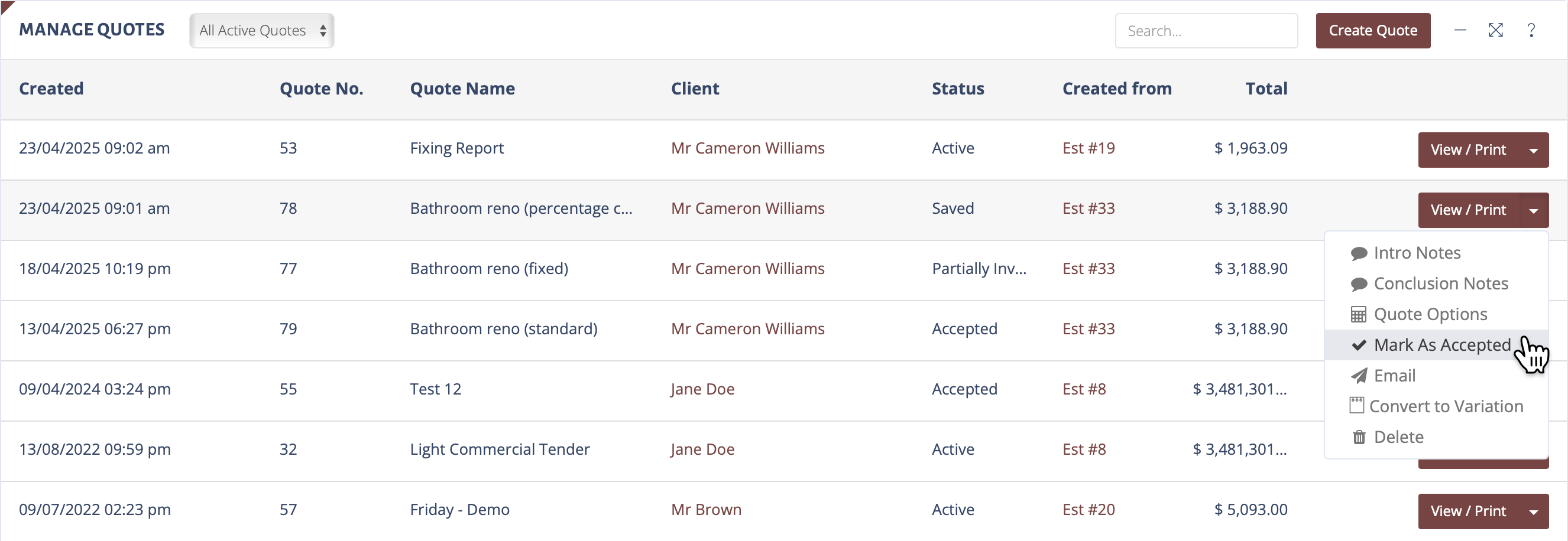 Once you have created a quote, you need to mark it as "Accepted" via the drop-down option of the 'edit' button in the 'Manage Quotes' area, this means the client has accepted the quote and we're ready to move forward with payment.