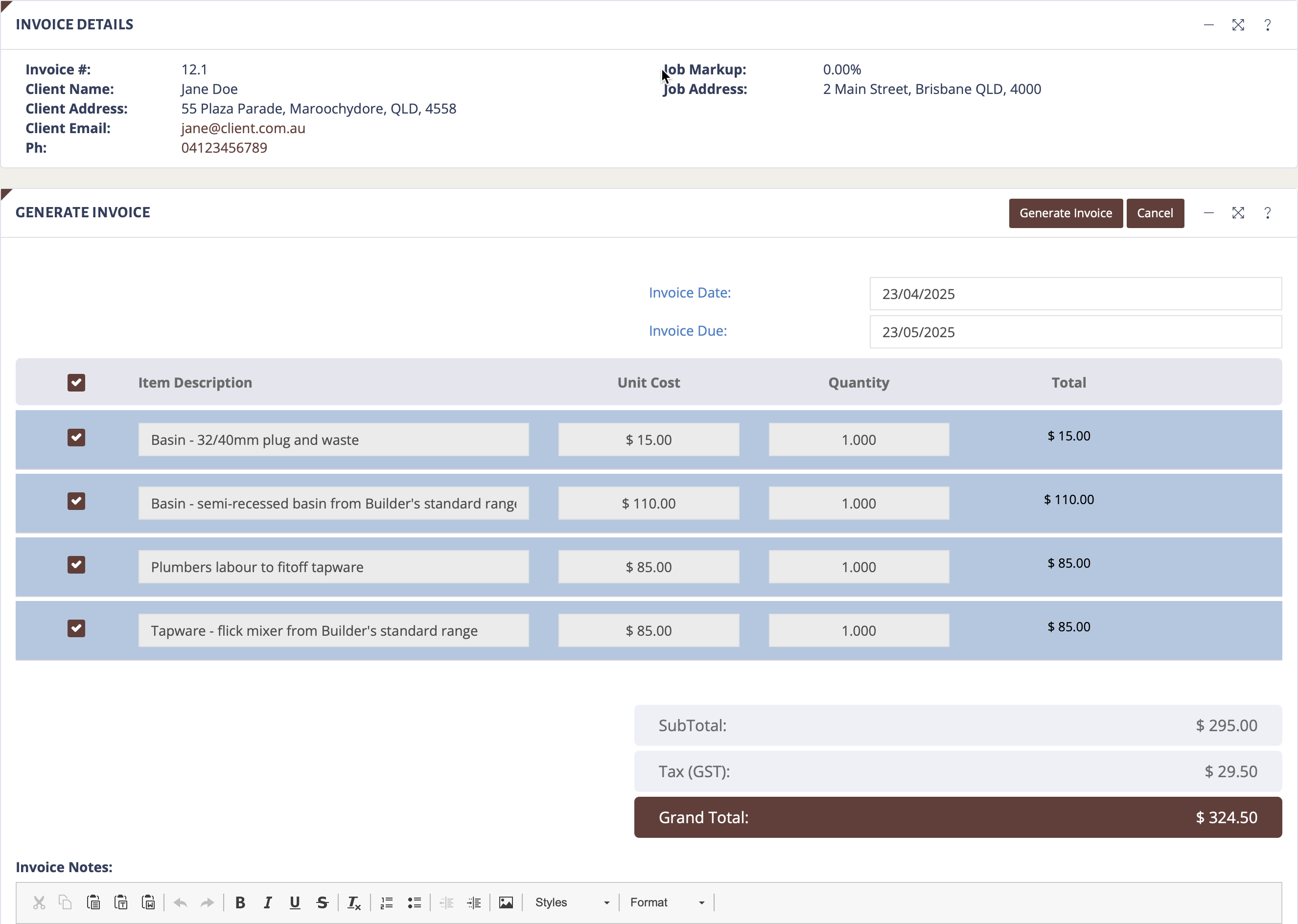 Now you'll find yourself at a similar screen to the quoting screen but this is to generate our invoice, as you can see on the left side, there's a checkbox for each line item, this allows you to create part-payments or 'split invoices' meaning you can choose to invoice only part of the quote now and then repeat the invoicing process again later to generate an invoice for the next part of the quote. The ability to create payment stages is really helpful if the overall invoice is for a whole project or you need to work to progress claim stages.