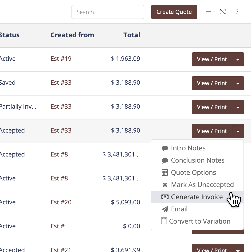 Once you mark the quote as accepted, if you click the edit drop-down a second time, you'll see a new option 'Generate Invoice' click this to go to the next step.