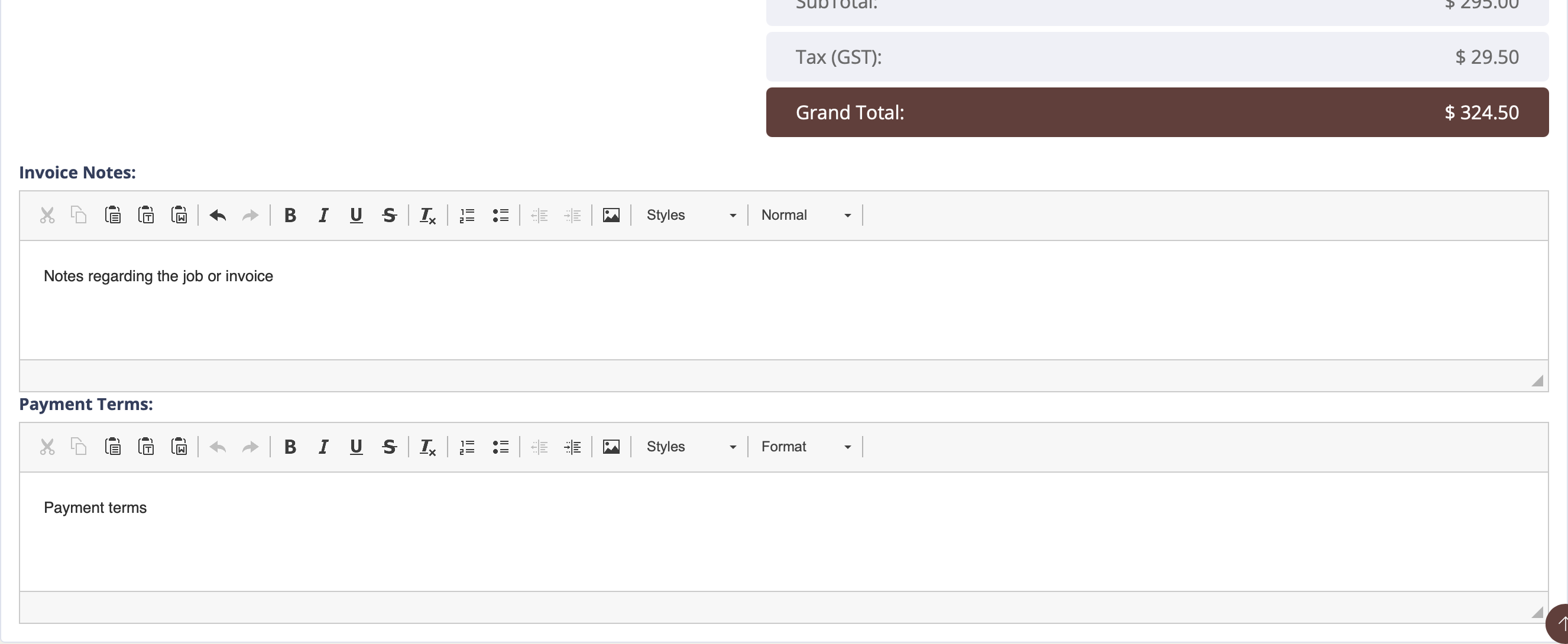 Just like the Quotes, we have an area for any notes and payment terms as well.