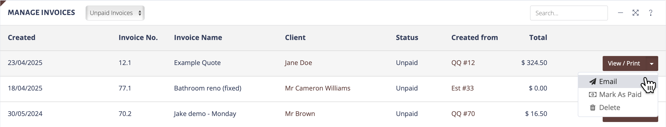 The invoice is now generated and stored in the Invoices area in the main menu (and within the Job / Opportunity) - from here you can Email, Print and View the Invoice just like all the other areas of MyConstruct.