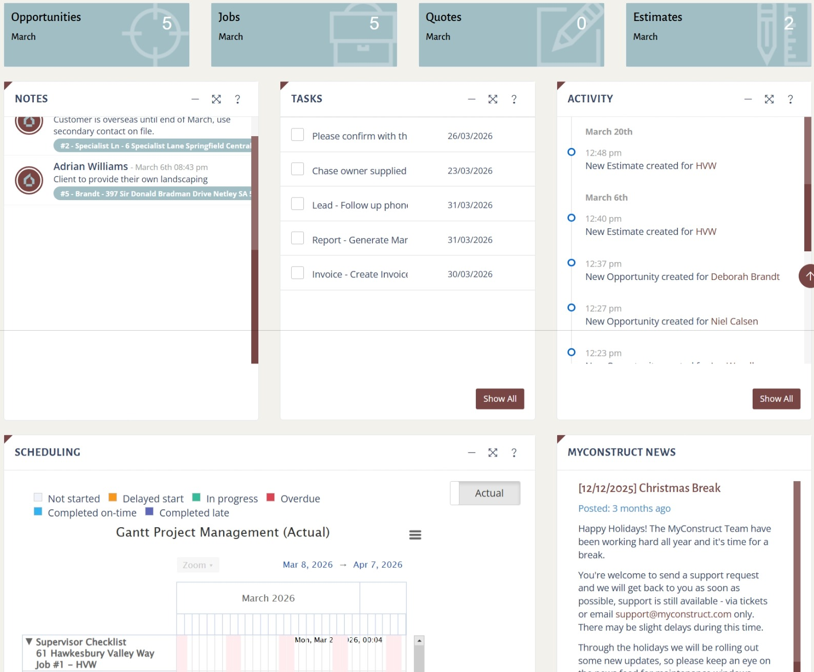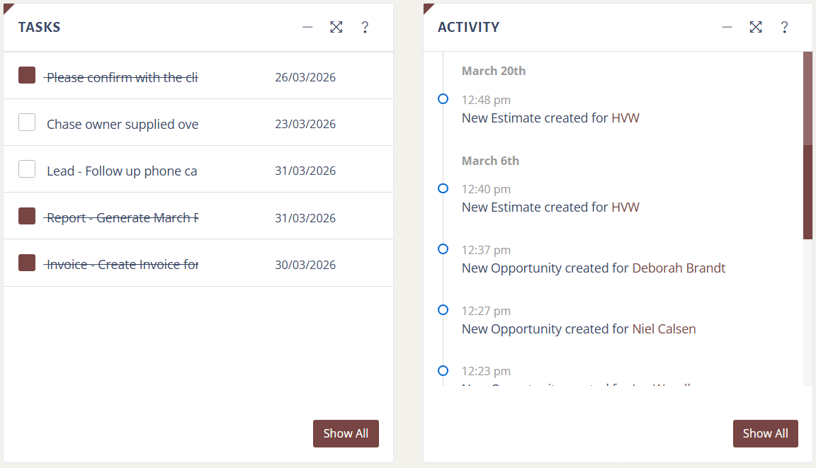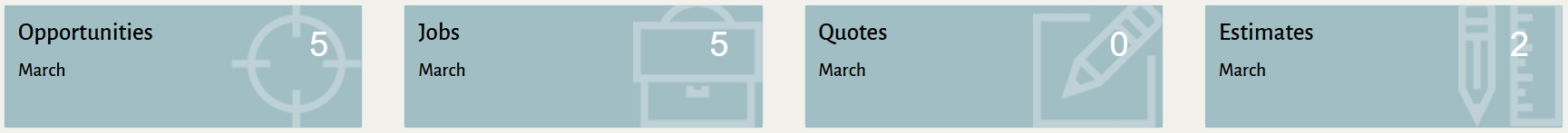 You can create new opportunities and access detailed information for each one. Within an opportunity, you can manage related items like tasks, scheduling, notes, estimates, quotes, files, and emails—all in one place.
