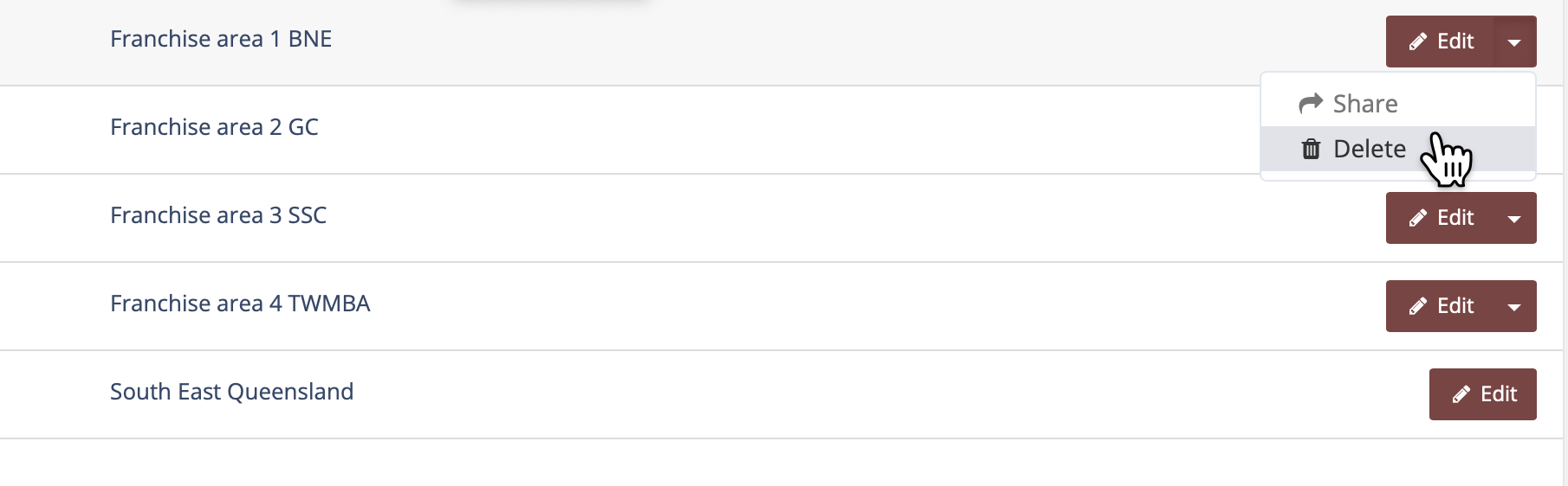 Deleting the Pricing Area is easy. Just click the dropdown arrow next to the "Edit" button of the Pricing Area you'd like to delete. Then click the delete option.