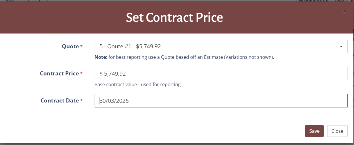 Then simply enter the Contract Price (the Quote input will show you the total there if there's no difference so you can just copy it). Finally select a Contract Date - this will give MyConstruct all the variables it needs to report on and let it know what to use as a base to log bills against.