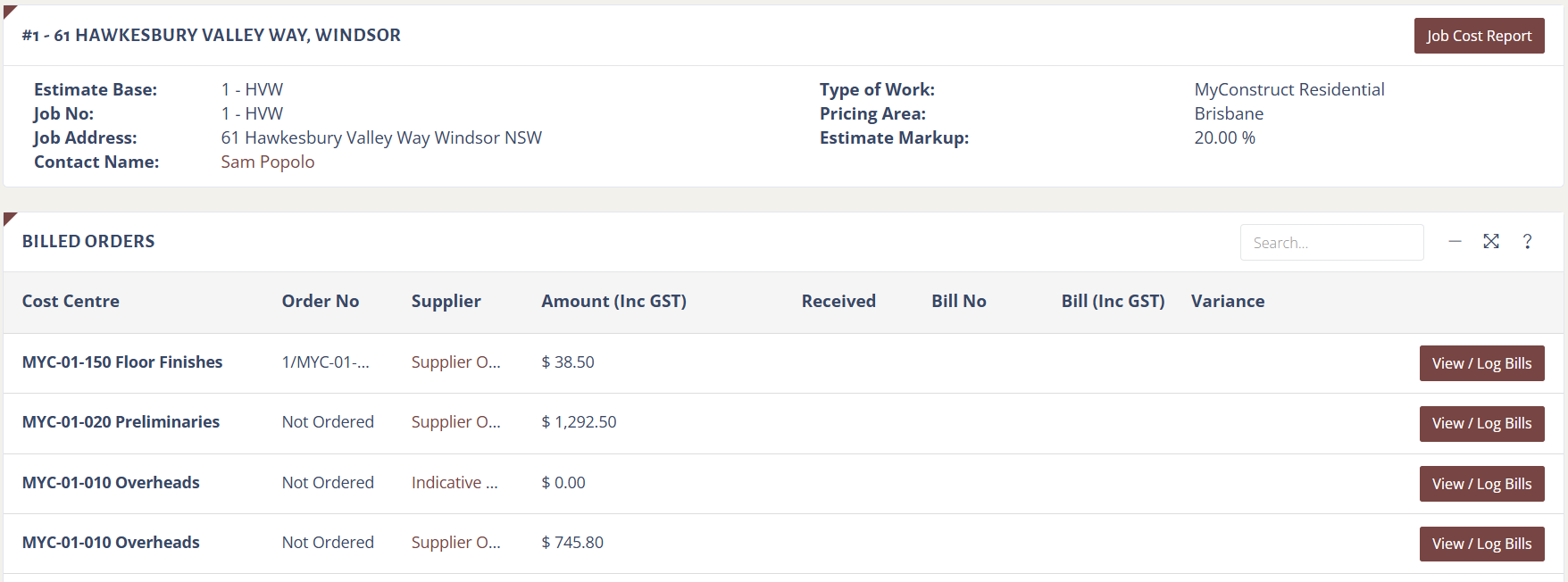 MyConstruct has a suite of reporting tools that allow you to track the cost of your jobs by comparing the Ordered values VS the Bills received and comparing them to the Contract, also allowing you to log overruns / additional bills for any extras that may arise along the way.