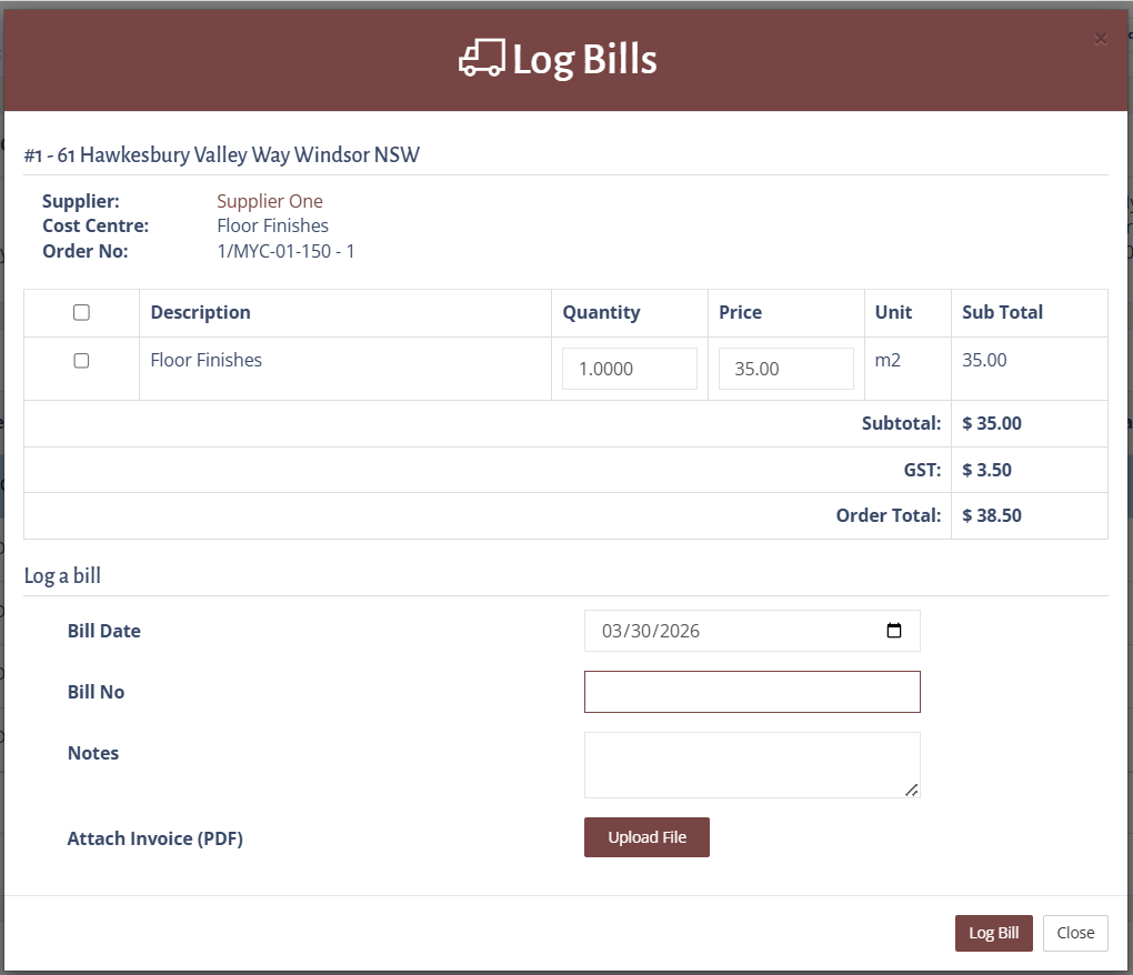 From here you can select the items on the order that the supplier has invoiced for (using the check-boxes), and those costs / quantities can be adjusted if needed. MyConstruct will calculate the variance after you log the bills, which helps you track if the cost was less or more than allowed for (ordered value).