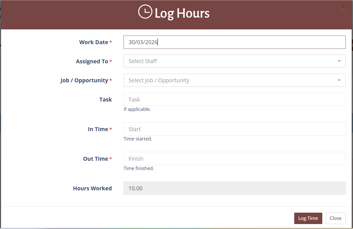 This section will pre-populate based on timesheets that staff have logged against this job. If you have already set a 'Contract Price' on the job and it's based on an Estimate, your staff will have the ability to log hours against Cost Centres to help you see clearly where the hours were logged. The table will display a list of staff and a count of hours they have assigned to this job.