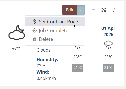 1. First we need to tell MyConstruct the Job contracted price as this is used to calculate our projections, to do this you simply navigate to the job from the left menu "Jobs" and then "Manage Jobs" - click "View" on the job you want to report, then in the upper right "Edit" options, select the "Set Contract Price" option.