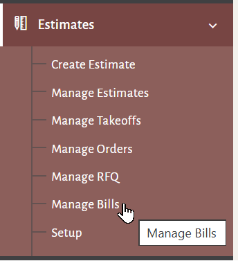2. To navigate to "My Bills" simply click on the "Estimates" option and then the sub menu "Manage Bills". This will take you to a table that shows all jobs which have Estimates assigned to them.