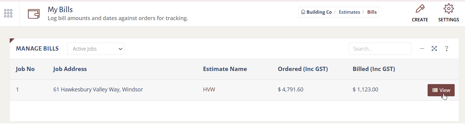 Jobs show in a table that has an overview of the Ordered value VS the Billed values, click View on the job you'd like to start logging bills for.