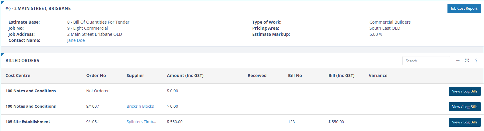 This will take you into the 'My Bills' screen for that job, from here you can start to log bills and generate the Job Cost Report once you have some data logged.