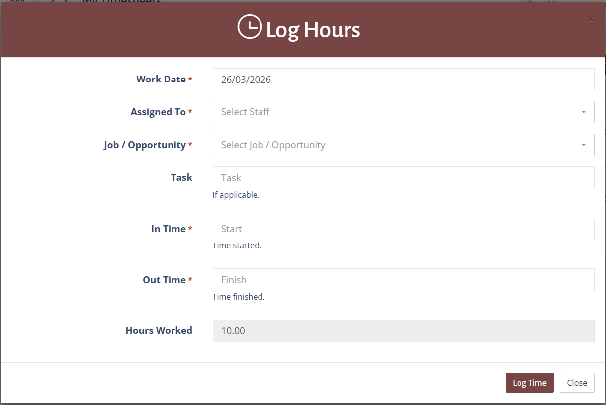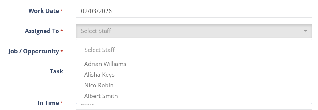 Assigned To: Manager only option, this allows you to assign hours to other staff if you permissions allow.