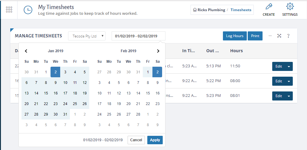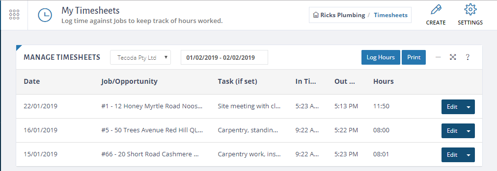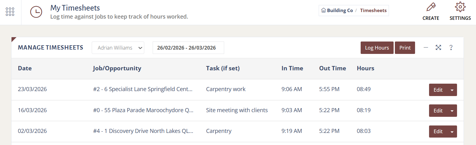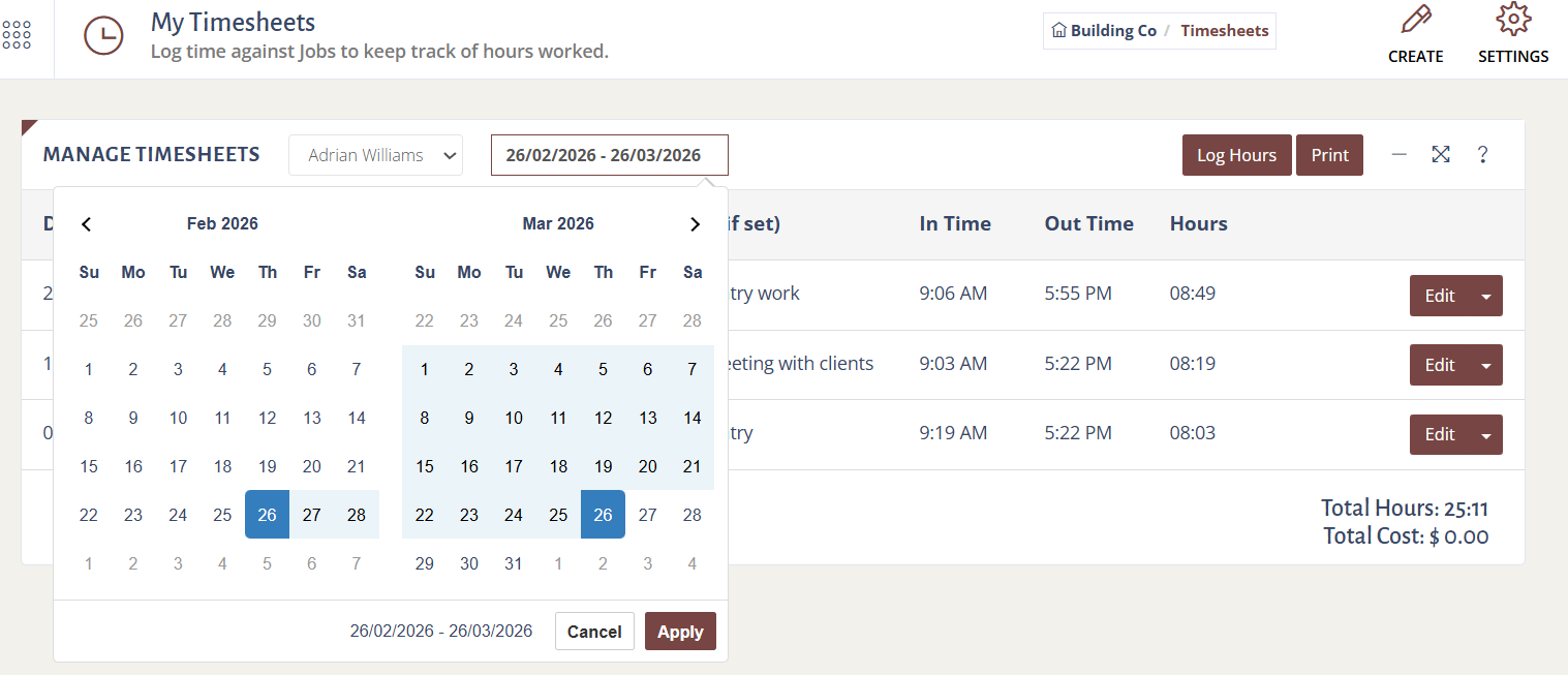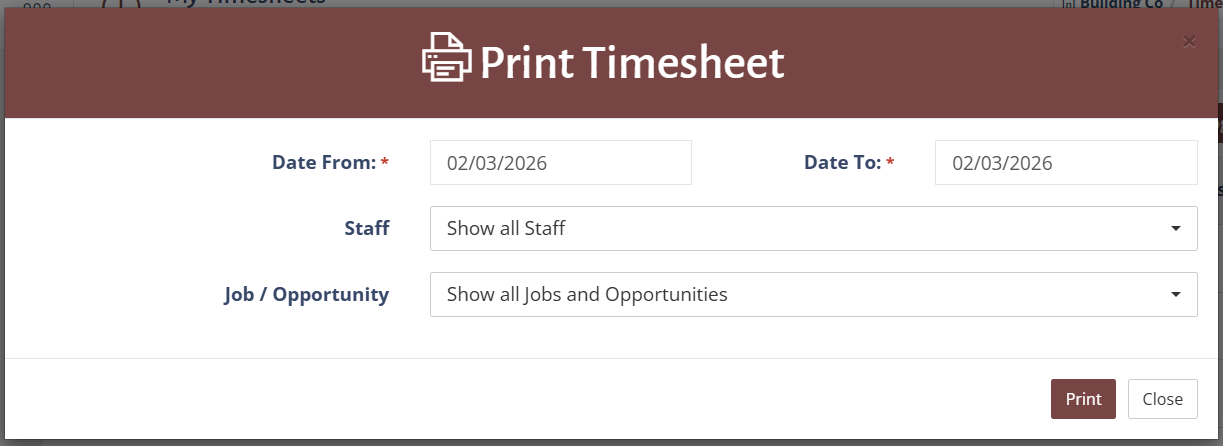 Finally, you can print / PDF your Timesheets from the "Print" button and selecting the options you'd like to print.
