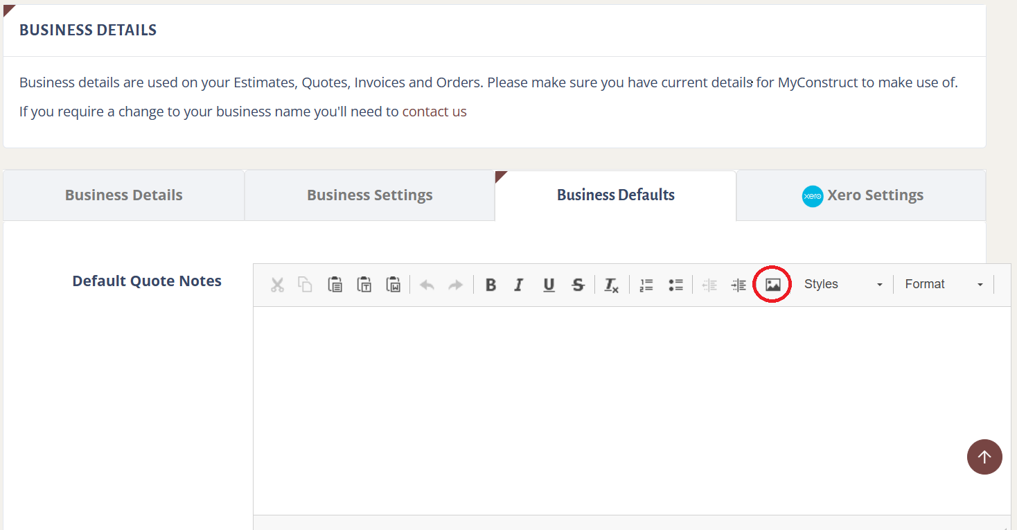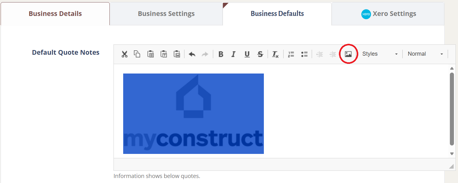 All you need to do is find the attach picture button, in this example we'll update your default (standard) quote notes, which is found in the "Business Details".